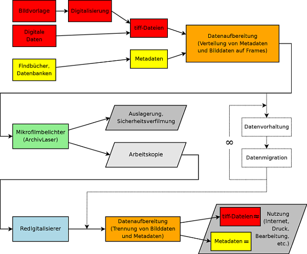 Dabei werden durch eine genaue Spezifikation aller Einzelschritte der Herstellungskette und einer Ausbelichtung der digitalen bzw. digitalisierten Daten auf Farb-Mikrofilm die jeweiligen Vorteile digitaler und analoger Daten in einem integrierten Gesamtsystem genutzt. Es entsteht ein Datensystem, in dem einerseits jederzeit verfügbare digitale bzw. digitalisierte Daten elektronisch genutzt und andererseits über eine Farb-Mikroverfilmung hochwertig und sicher langzeitarchiviert werden können. Diese Vernetzung von analogen und digitalen Techniken eröffnet weltweit ganz neue Möglichkeiten im Umgang mit erhaltungswürdigem Kulturgut und der Verarbeitung diesbezüglicher Daten.