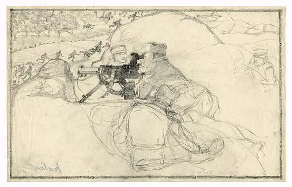 Bei den Bildern, die Prof. Paul Lang-Kurz während seiner Zeit als Gefreiter im württembergischen Gebirgs-Bataillon (1915-1918) anfertigte, handelt es sich vorrangig um Bleistiftzeichnungen, vereinzelt auch um Pastellkreidearbeiten, mit denen er den Lageralltag an der Front einzufangen versuchte. Hierbei entstanden vor allem Portraitstudien von Kameraden, aber auch Bilder vom Leben der Soldaten in der Etappe und den Kampfgebieten in Frankreich, Rumänien und Italien. Ergänzt wird das Spektrum seines Schaffens durch zahlreiche Illustrationsentwürfe für die Feldzeitung des Gebirgs-Bataillons.