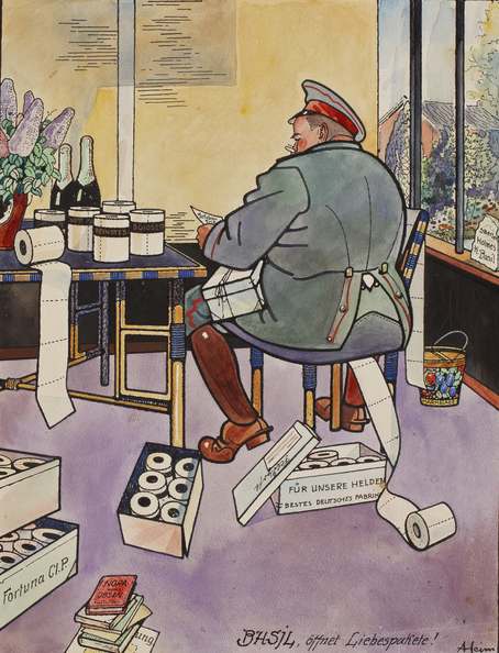 Einen ganz und gar ungewohnten Blick auf das Kriegsgeschehen werfen die Aquarelle und Gouachen des gelernten Lithographen Albert Heim. Seine Bilder, die überwiegend in den Jahren 1915/1916 entstanden, brechen mit den stereotypen Mustern militärischer Selbstinszenierung; sie überraschen mit einer unbeschwert-persönlichen, ja geradezu schelmischen Note.