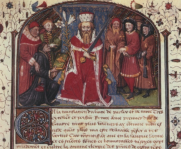 Abbildung von Herzog Amadeus VIII. in der französischen Übersetzung der moralischen Abhandlung "De doctrina dicendi et tacendi" und "De amore et dilectione Dei" von Albertanus von Brescia, um 1430, Bibliothèque royale de Bruxelles