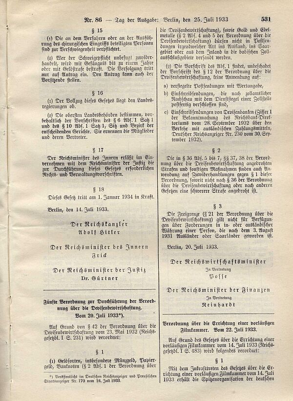Der Nationalsozialismus griff diese Ideen auf und erhob die Forderung, die Träger von "erblicher Minderwertigkeit" an der Fortpflanzung zu hindern. Das Gesetz zur Verhütung erbranken Nachwuchses vom 14. Juli 1933 schuf die Grundlage für die Zwangssterilisation von rund 500.000 Menschen. Es erzwang die Sterilisation von Männer und Frauen, die an Schwachsinn, Schizophrenie, Epilepsie, Taub- und Blindheit sowie an angeborenen körperlichen Missbildungen litten. Die Zwangssterilisation eskalierte jedoch schon bald in der Forderung nach der "Vernichtung lebensunwerten Lebens".