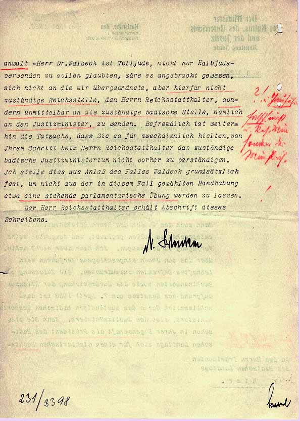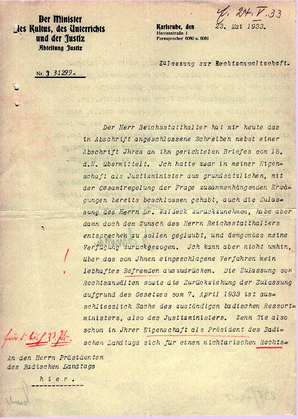 Das Quellenbeispiel enthält die Stellungnahme des entscheidungsberechtigten badischen Ministers Otto Wacker. Wacker erklärte sich, vor allem auf Grund der Intervention des Reichsstatthalters, bereit, das schon beschlossene Berufsverbot für Rechtsanwalt Waldeck aufzuheben. Sehr deutliche Kritik übte er dabei an dem Bittsteller Kraft: Dessen Petition an Wagner bewertete er als eine nicht zufällige, sondern politisch absichtliche bürokratische Fehlleistung des Landtagspräsidenten. - Handschriftliche Vermerke auf dem Originalschriftstück zeigen die Reaktion des Landtagspräsidenten. Sie machen deutlich, wie wenig er mit der Argumentation des Ministers einverstanden war.